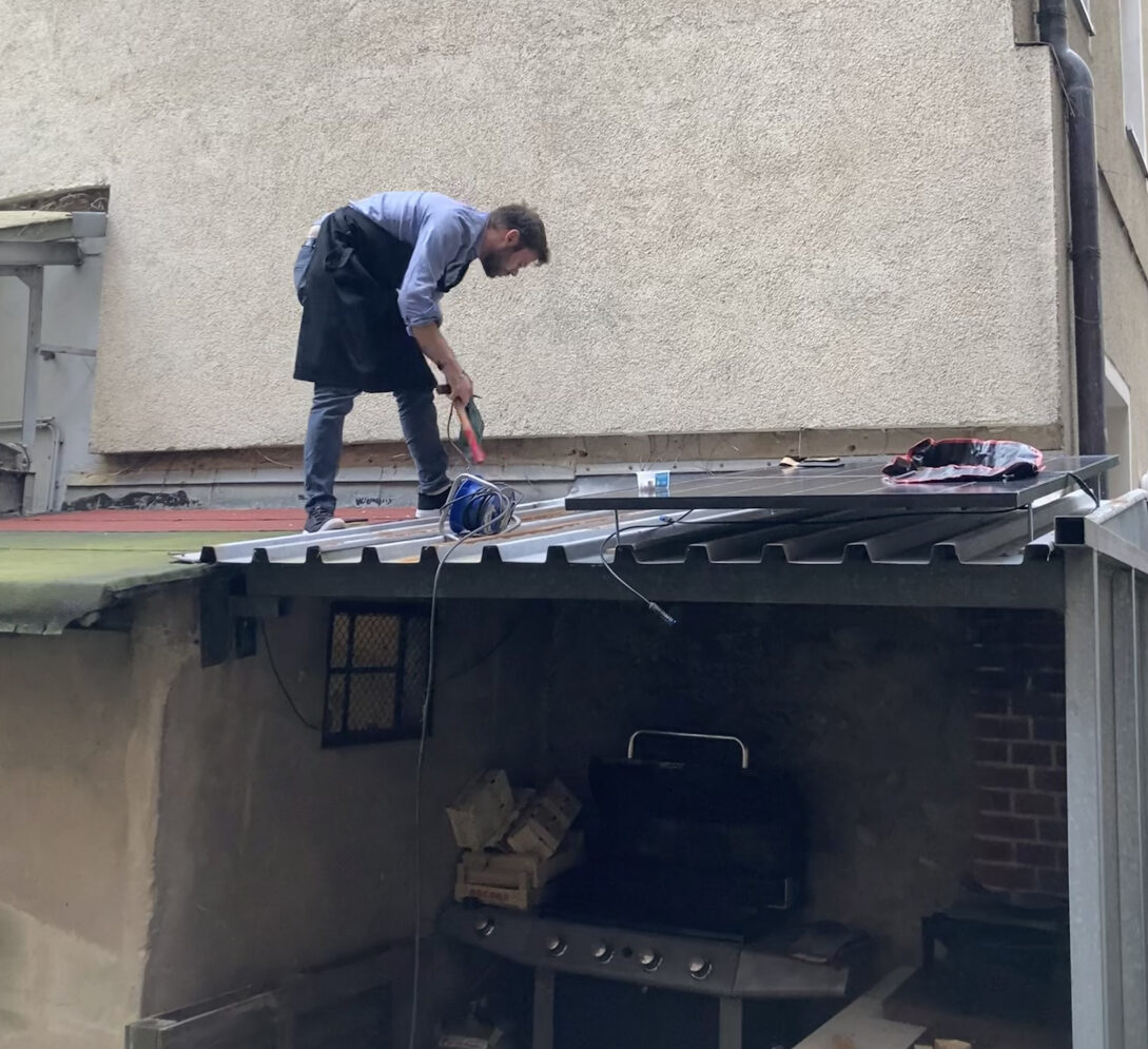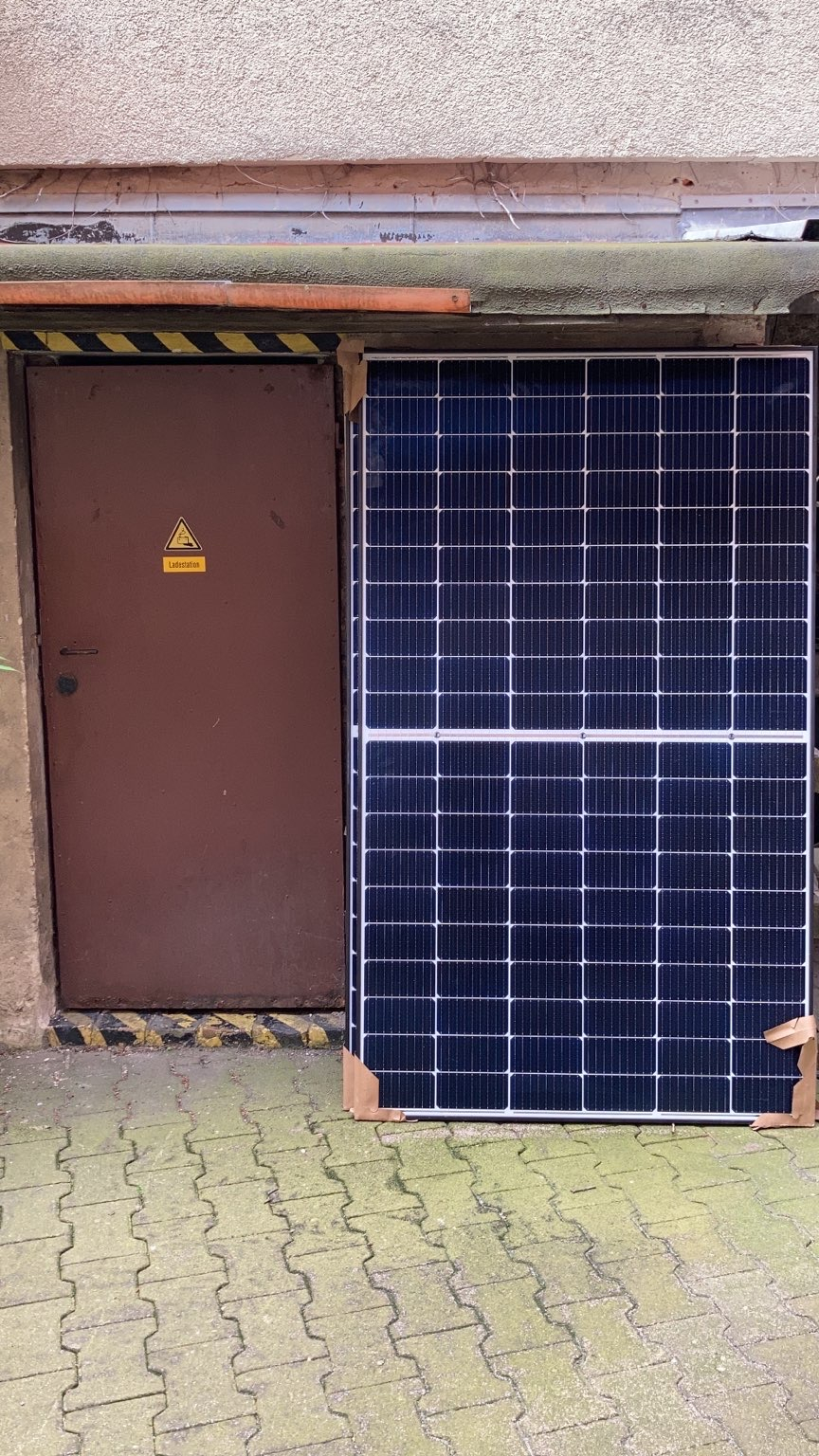 Weil wir immer wieder gefragt werden, wie groß so ein PV-Modul eigentlich ist, haben wir ein Foto vor der Montage gemacht. Ja, unser Modell ist größer als die Tür 🙂 Die Maße liegen bei 1,70 zu 1,10 m bei etwa 20 kg pro Stück.