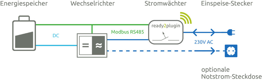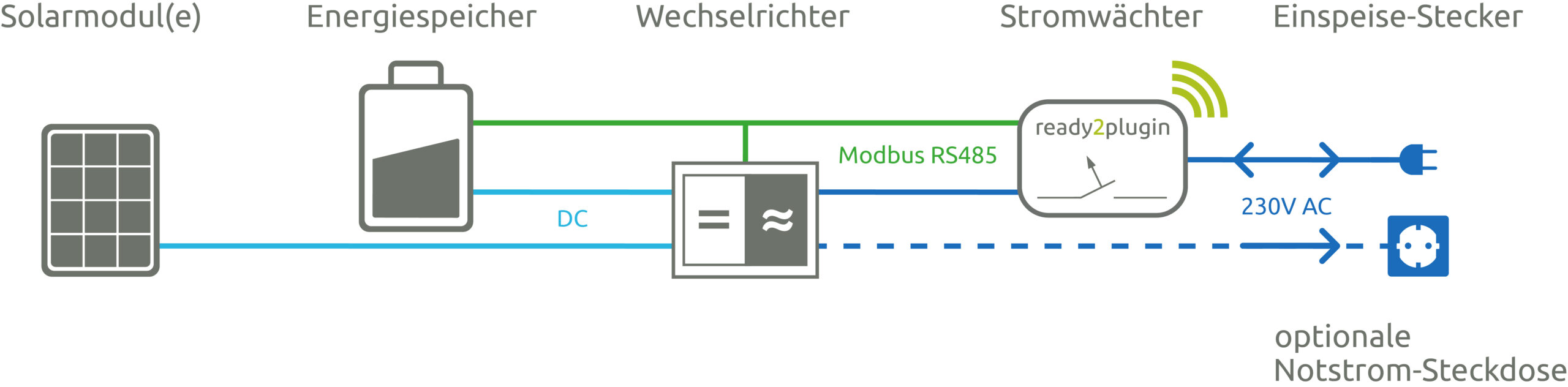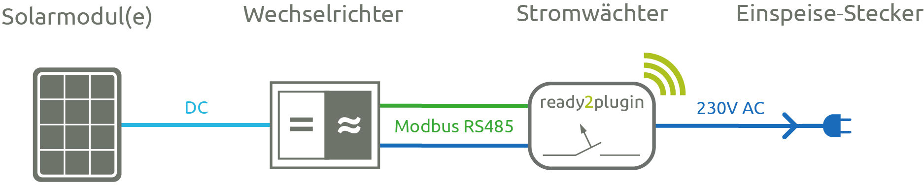 Der ready2plugin Stromwächter (auch Einspeisewächter genannt) regelt den Wechselrichter über die RS485-Schnittstelle, um Überlastungen des Stromkreises zu verhindern. (Nebenbei ermöglicht diese Funktion auch die Begrenzung der Netzeinspeisung und damit die Optimierung des Solarstromverbrauchs mittels Energiespeicher.)